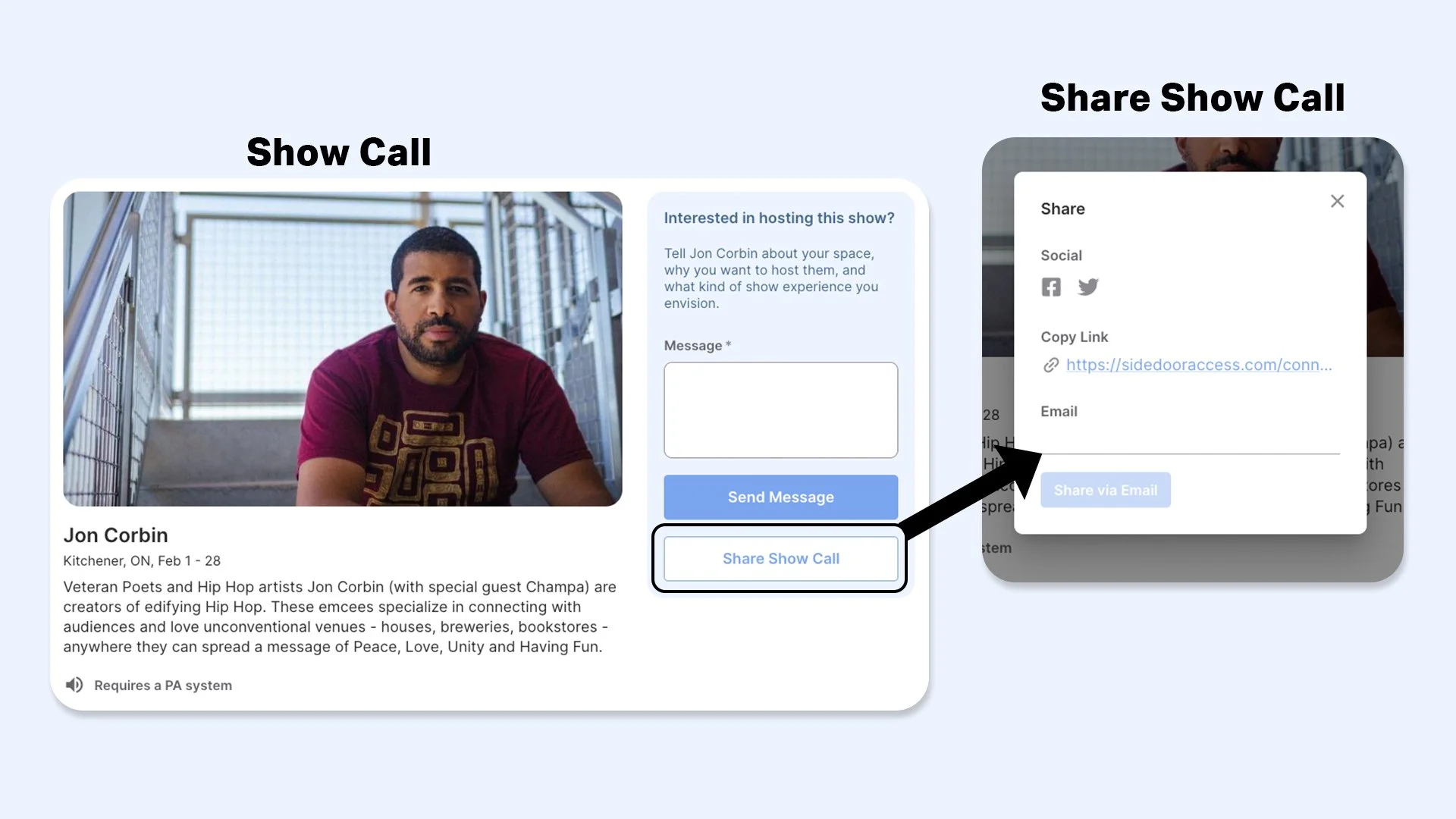 By sharing your Show Call on your socials, newsletter, or website, you’re giving your supporters a unique opportunity while unearthing new hosts not yet on Side Door, and increasing your success rate of booking a show. Cha-ching!