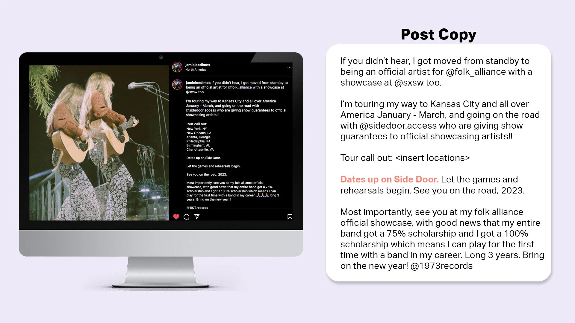 Here’s a fantastic example of an IG post from singer-songwriter and multi-instrumentalist Jamie-Lee Dimes: